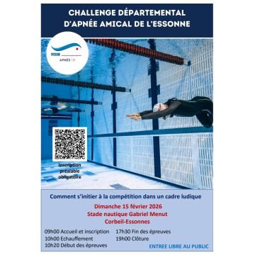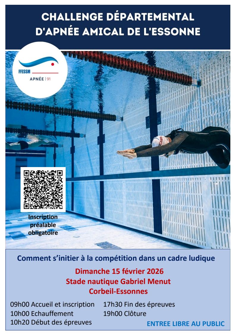 La commission apnée du CoDep91 organise la quatrième édition du "Challenge Apnée Essonne" (ouvert au public), le dimanche 15 février 2026 de 9h00 à 18h00 au Stade nautique Gabriel Menut de Corbeil-Essonnes (Club Tortue Marine).